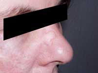 Ausgeschnittener Hauttumor der Nase, angezeichnete Schnittführung des Defektverschlusses mit sogenanntem “zweizipfligen Lappen”.