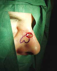 Ausgeschnittener Hauttumor der Nase, angezeichnete Schnittführung des Defektverschlusses mit sogenanntem “zweizipfligen Lappen”.